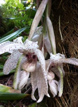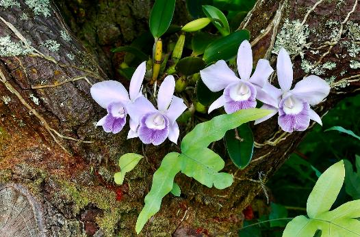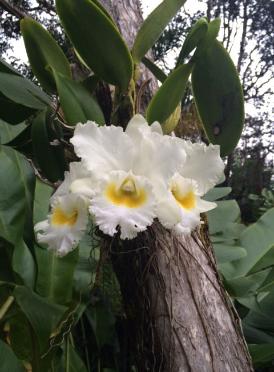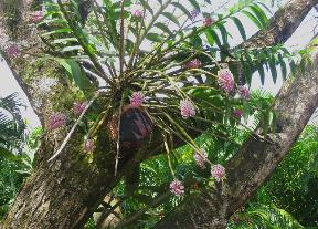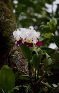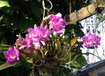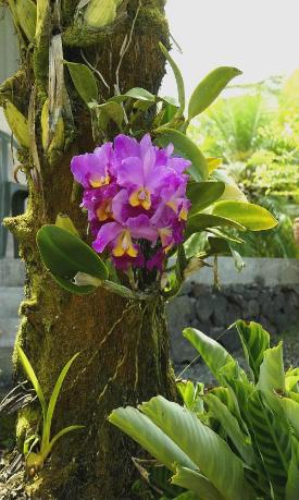 These catleyas grow on an Australian tree fern tree in front of my home on the Big Island, Hawaii. This year they bloomed with 6 blossoms without ever having been fertilized. So I am beginning to be convinced that orchids do not need all that fertilizer we generally give them in the greenhouse from 1/2 to 1 teaspoon per gallon of water. Maybe that is necessary for commercial growers to get their crops growing faster. Observing them grow on trees for years, my experience has been that they bloom very well without fertilizing them. Of course, if there is heavy rain it can destroy the blossoms. |