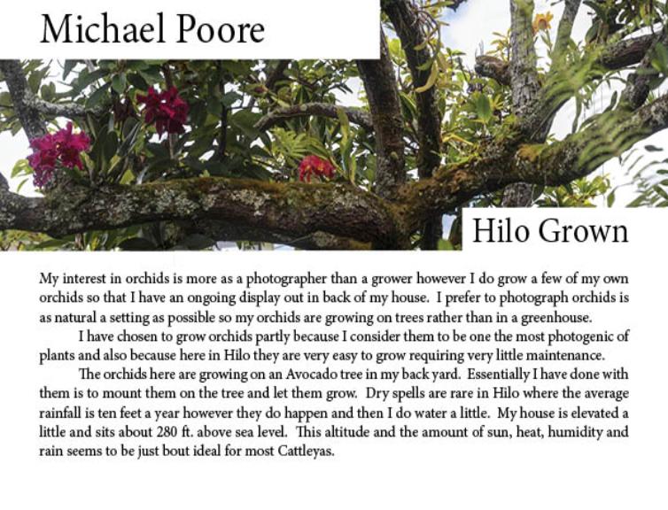 Growing cattleyas on an Avocado tree My interest in orchids is more as a photographer than a grower however I do grow a few of my own orchids as an ongoing display out in the back of my house. I prefer to photograph orchids in a rather natural as possible setting hence growing them on trees and not in a greenhouse environment. I have chosen to grow orchids partly because I consider them to be one of the most photogenic of all plants and also here in Hilo,Hawaii they are very easy to grow and require very little maintenance. The featured orchids are growing on an Avocado tree in my back yard. Essentially what I did with them is mounting them on the tree and let them grow freely. Dry spells are rare here in Hilo, Hawaii where the average rainfall is about ten feet a year however they do happen ever so often and then I do water them accordingly. My house sits 280 ft. above sea level. This altitude and the amount of sun, heat , humidity and rain seems to be just about right for all of the Cattleya alliance. |
